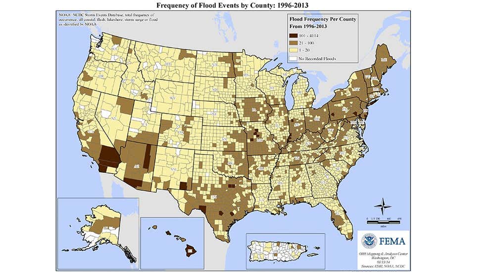 Stany: Illinois, Indiana, Kentucky, Tennessee, Arkansas, Floryda, Texas, Arizona, Luizjana, Alaska, południowa i centralna Kalifornia oraz większość stanów północno-wschodniej części USA są każdego roku narażone na poważne powodzie. Na świecie największe powodzie występują w Syberii, tuż pod