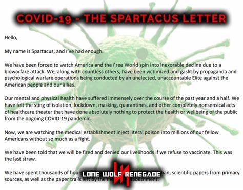Zgodnie z raportem Institute For Coronavirus Emergence Nonprofit Intelligence (ICENI) zatytułowanym “Spartacus Letter” (List Spartakusa) COVID-19 NIE JEST naturalnym schorzeniem systemu oddechowego, ale schorzeniem naczyń krwionośnych, ponieważ wirus SARS-CoV-2 atakuje wyściółkę ludzkich naczyń krwionośnych. W Liście Spartakusa czytamy między innymi: „Prawidłowe leczenie ciężkiej sepsy związanej z COVID-19 to nieinwazyjna wentylacja, steroidy i wlewy przeciwutleniaczy. Większość leków ponownie przeznaczonych do leczenia COVID-19, które wykazują jakiekolwiek korzyści w ratowaniu krytycznie chorych pacjentów z COVID-19, to przeciwutleniacze. N-acetylocysteina, melatonina, fluwoksamina, budezonid, famotydyna, cymetydyna i ranitydyna są przeciwutleniaczami. Indometacyna zapobiega napędzanemu przez żelazo utlenianiu kwasu arachidonowego do izoprostanów. Istnieją silne przeciwutleniacze, takie jak apocynina, które nie zostały jeszcze przetestowane na pacjentach z COVID-19, które mogą odstraszać neutrofile, zapobiegać peroksydacji lipidów, przywracać zdrowie śródbłonka i przywracać dotlenienie tkanek. Dożylna Witamina C, przeciwutleniacz jest całkowicie skutecznym sposobem leczenia sepsy wywołanej przez COVID-19 i faktycznie jest teraz częścią protokołu MATH+ opracowanego przez Dr Paula E. Marika”. W odniesieniu do szczepień w tym samym dokumencie czytamy: „Szczepionki na COVID-19 nie sterylizują i nie zapobiegają zakażeniu ani przenoszeniu. Są to szczepionki ‘nieszczelne’. Oznacza to, że usuwają ewolucyjną presję na wirusa, aby stał się mniej śmiertelny. Oznacza to również, że zaszczepieni są doskonałymi nosicielami choroby. Innymi słowy, ci, którzy są zaszczepieni, są zagrożeniem dla nieszczepionych, a nie odwrotnie. Z drugiej strony naturalna odporność na COVID-19 z przeszłej infekcji jest znacznie silniejsza niż odporność wywołana szczepionką.